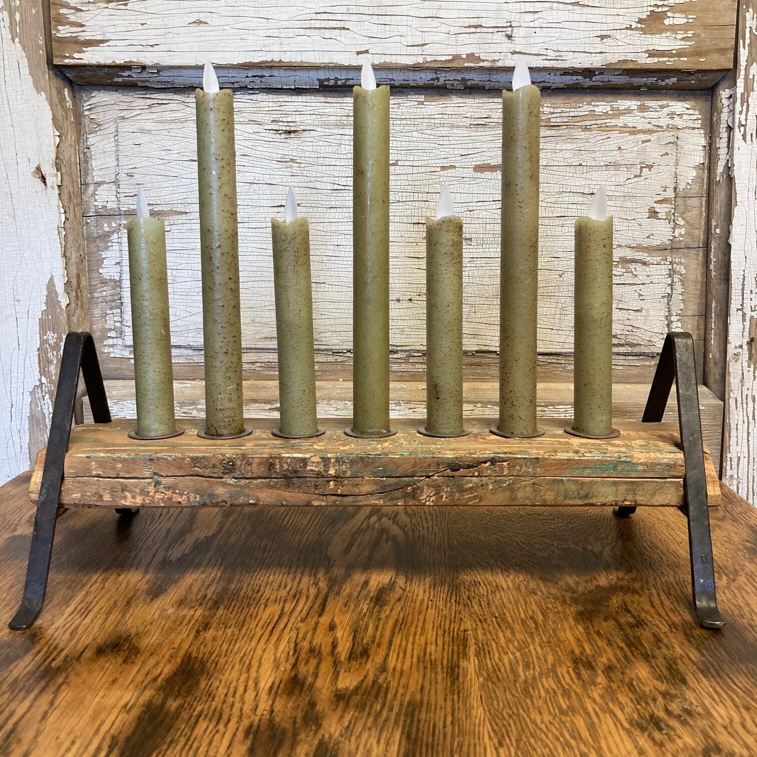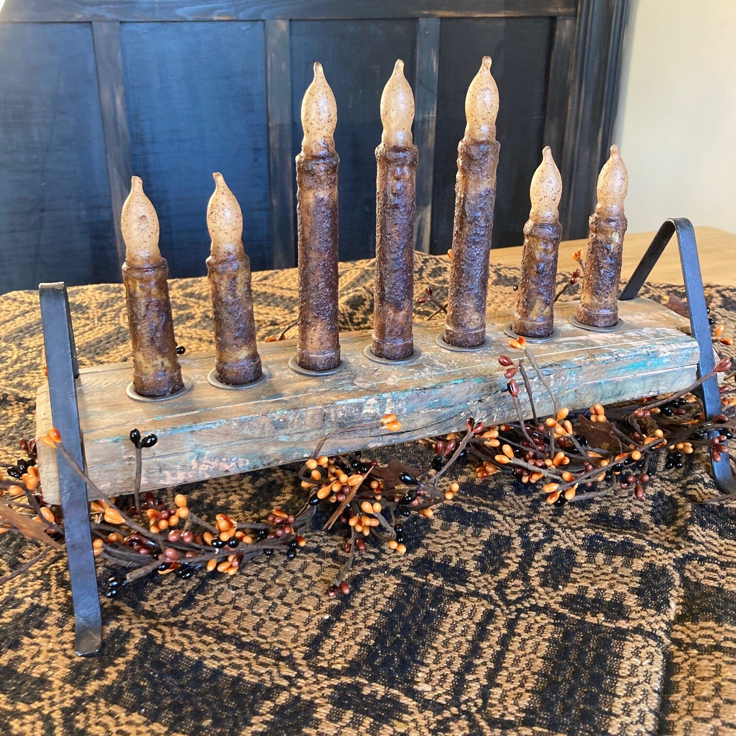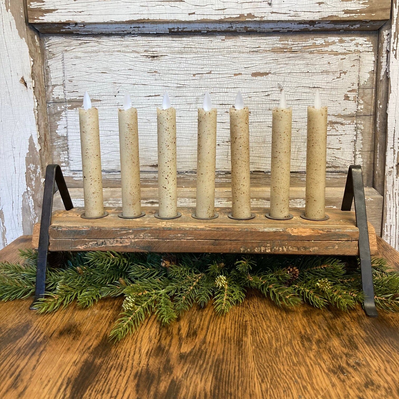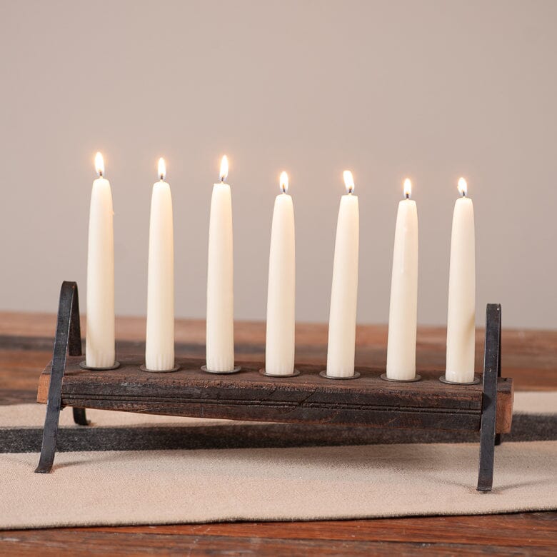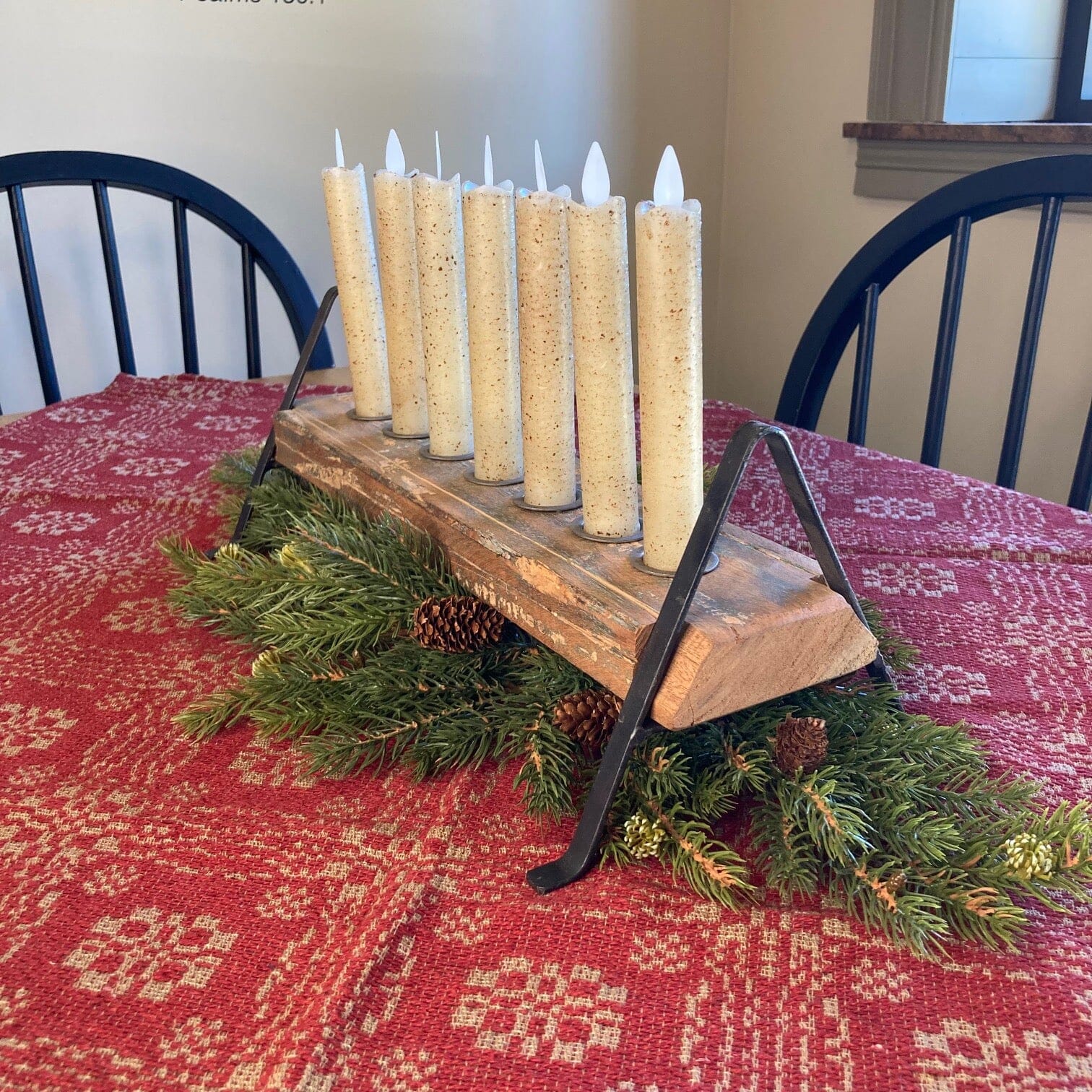 Make a statement in your living room or dinning room with this rustic seven taper candle holder.  A reclaimed wooden block held aloft by angular iron legs on either end give this candle holder a simple rustic look.  Charming by itself or dressed up with greenery and berry sprigs, this piece is versatile all year round.  Five solid metal inserts are positioned in the wood block evenly to display your taper candles.  Candles are sold separately and we have a large collection of options in our battery candle collection for you to choose from.  Enjoy the romance and comfort of soft candlelight in your home today with this lovely taper holder!