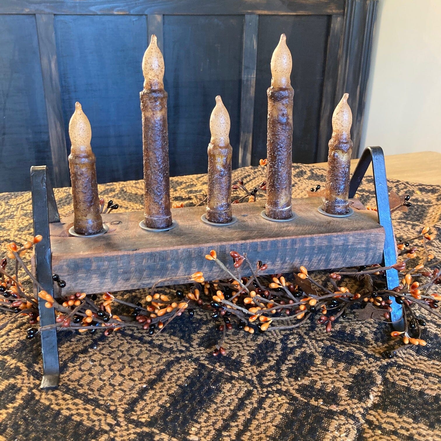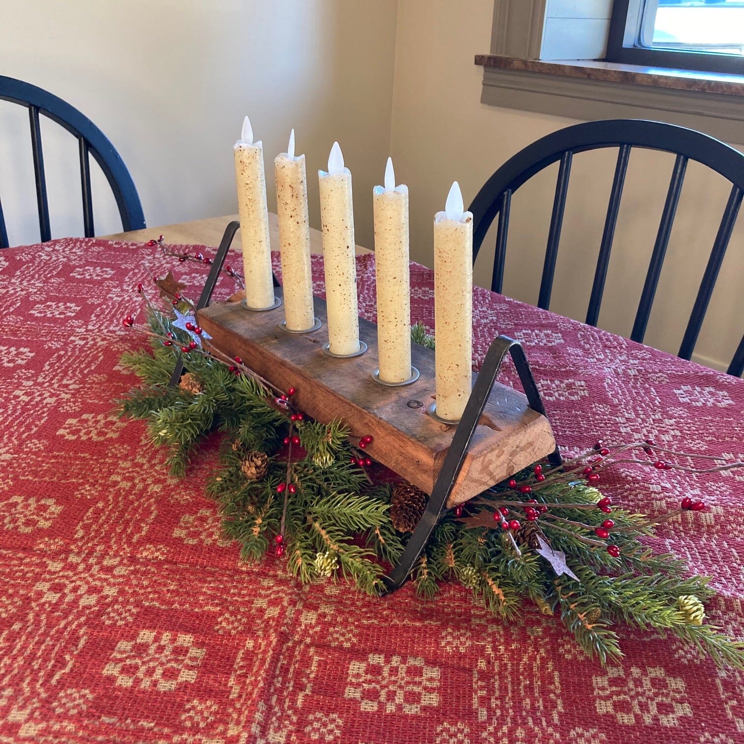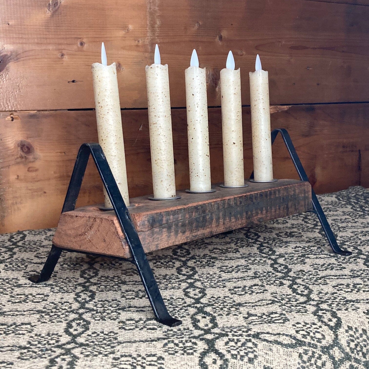 A reclaimed wooden block held aloft by angular iron legs on either end give this candle holder a simple rustic look that can be dressed up with greenery or make a statement all on it's own.  Five solid metal inserts are positioned in the wood block evenly to display your taper candles.  Candles are sold separately and we have a large collection of options in our battery candle collection for you to choose from.  Set this as a centerpiece on your table or mantle and enjoy year round!
