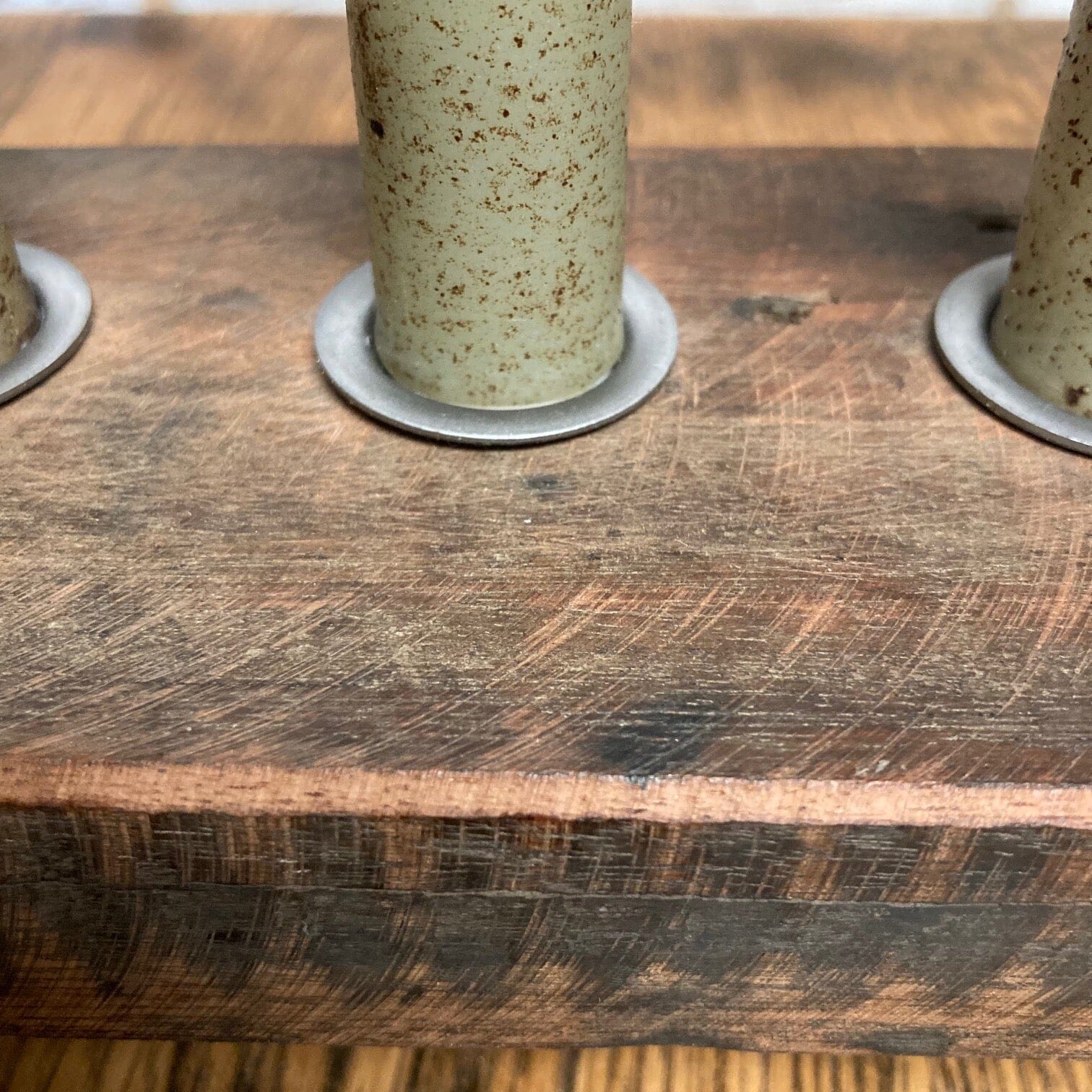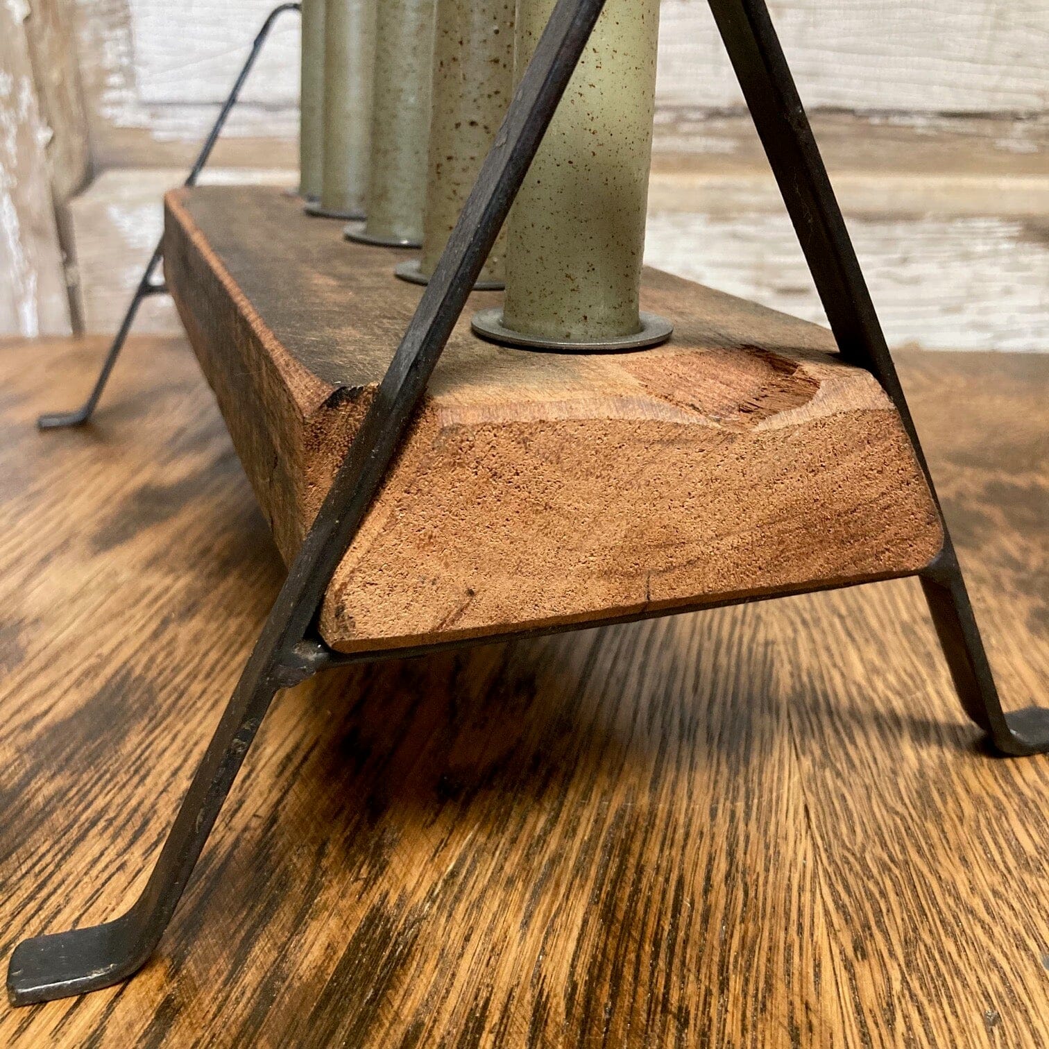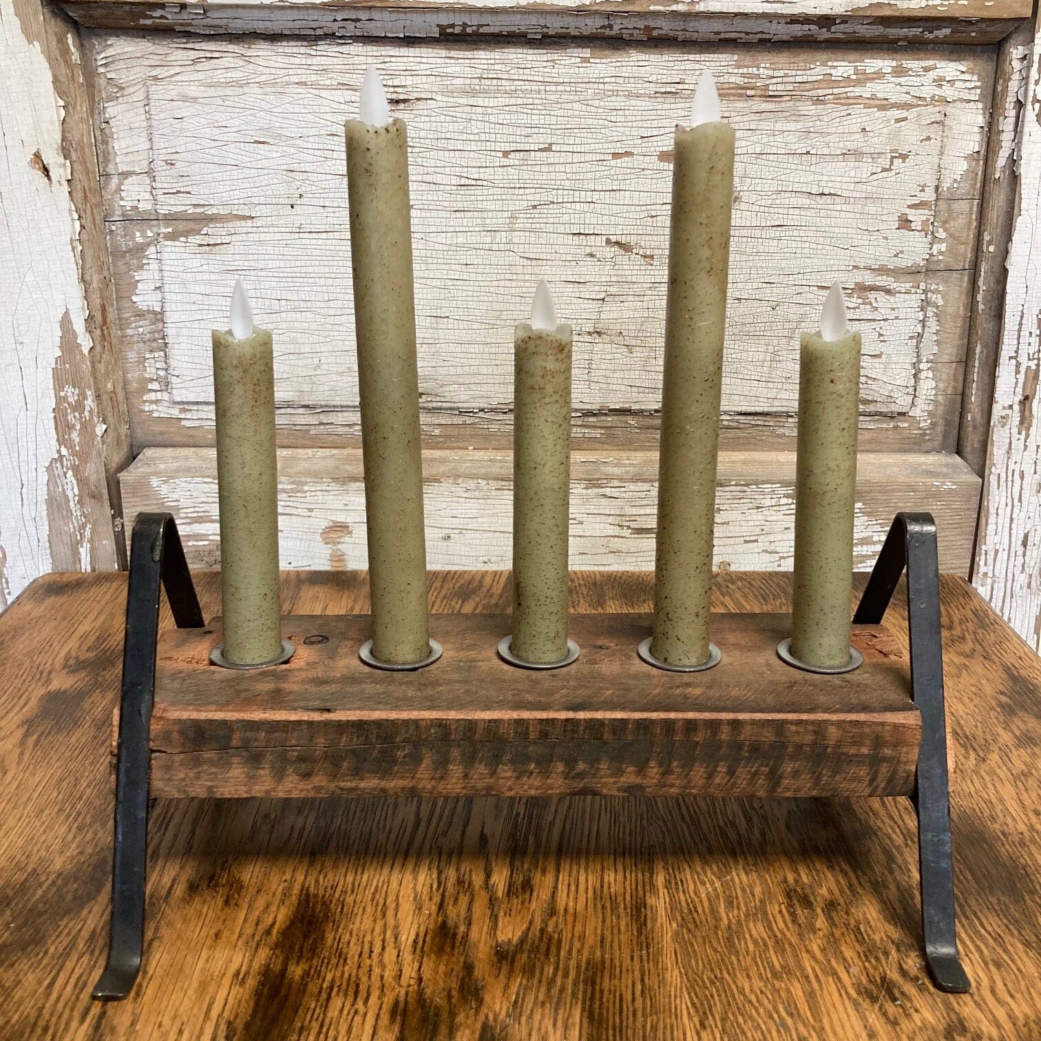 A reclaimed wooden block held aloft by angular iron legs on either end give this candle holder a simple rustic look that can be dressed up with greenery or make a statement all on it's own.  Five solid metal inserts are positioned in the wood block evenly to display your taper candles.  Candles are sold separately and we have a large collection of options in our battery candle collection for you to choose from.  Set this as a centerpiece on your table or mantle and enjoy year round!