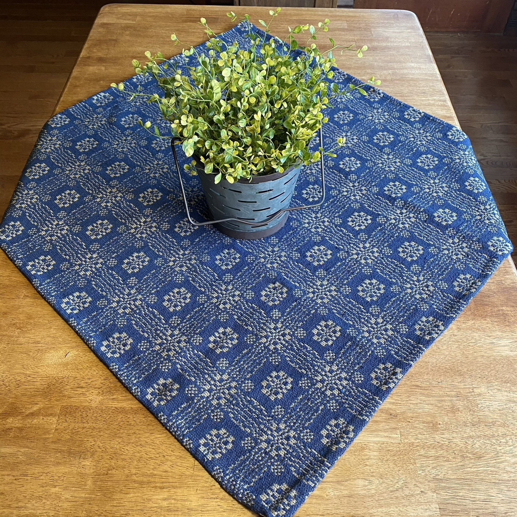 Table cloths are a great way to add protection and style to your wooden tables. Our smaller Gettysburg Navy and Tan woven small table cloth features country colors of tan and navy on a cotton material with a brocade style. This soft and durable table cloth can be used on many different wooden fixtures in your home. These small table cloths have slight variations in size with dimensions of 33-36". Add one of our primitive centerpieces to the top of it for the complete look! Be sure to check out the full Gettysburg Navy and Tan bedding collection to find more ways you can add this bold look to your home.