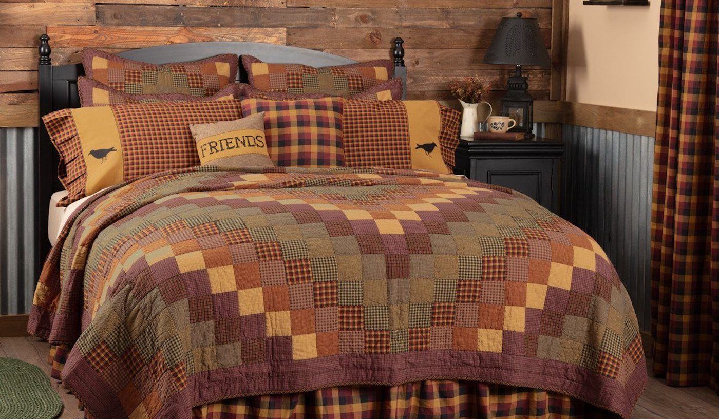Customers can find country primitive quilts and log cabin patchwork quilts consisting of buffalo check designs, stripes, and vintage floral prints. Each of our quilt types is alphabetically categorized and allows for sorting by best-selling and price, or by color and pattern. Refresh your space with our primitive bed quilts today.