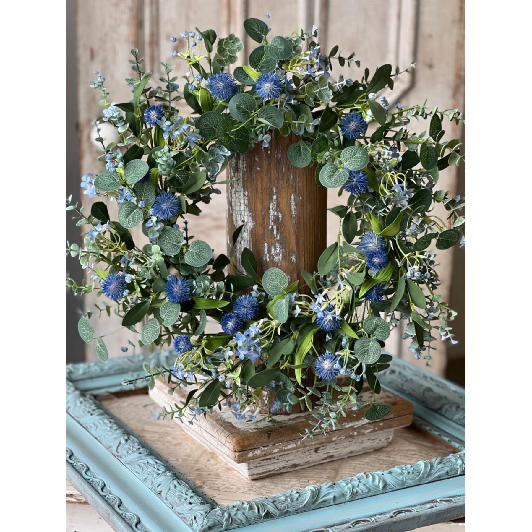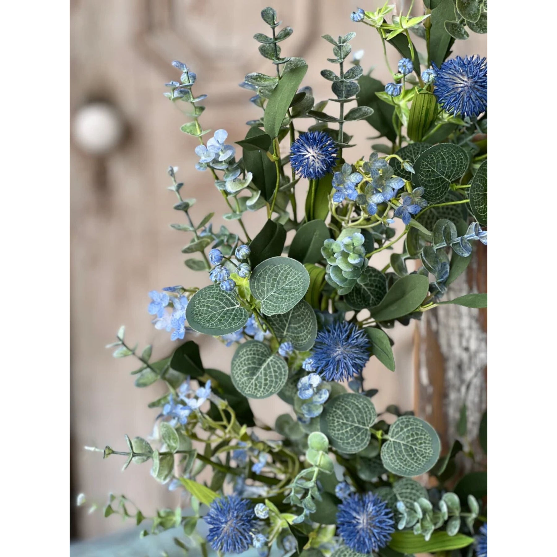 This Bluet Fields wreath offers a refreshing colorway for your Spring and Summer home decorating needs with it's darker toned greenery and harmony of tonal blues.  An abundance of textures, greenery types, and blooms makes this Bluet Fields collection one not to be missed!