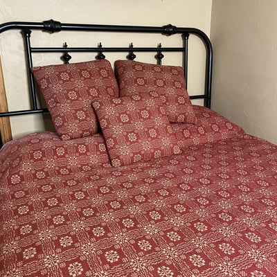 This luxurious woven coverlet has a quality you will feel instantly! These 100% cotton coverlets come in rich primitive cranberry and tan brocade and are generously sized for your bed. Show in picture with two of our Gettysburg Cranberry and Tan Woven Pillow 20" and one Gettysburg Cranberry and Tan Woven Pillow 16".